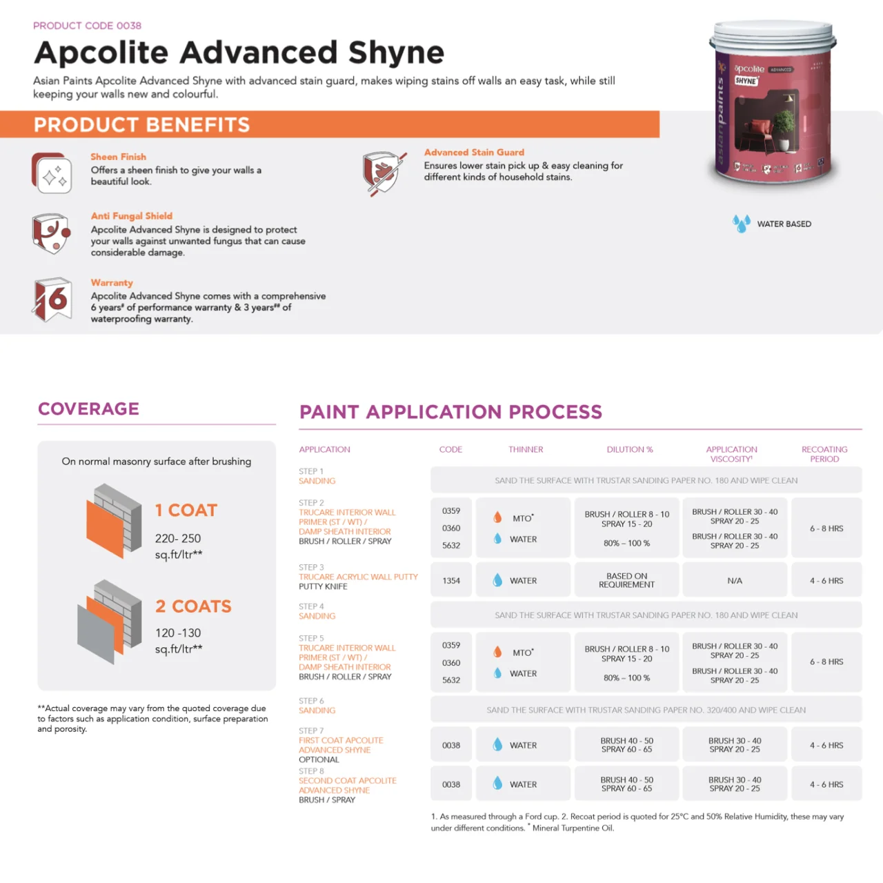 - Dilution: Mix **Asian Paints Apcolite Advanced Shyne Interior Emulsion** with clean water (40%-50% dilution). Stir well. Learn how advanced acrylics provide toughness and sheen.