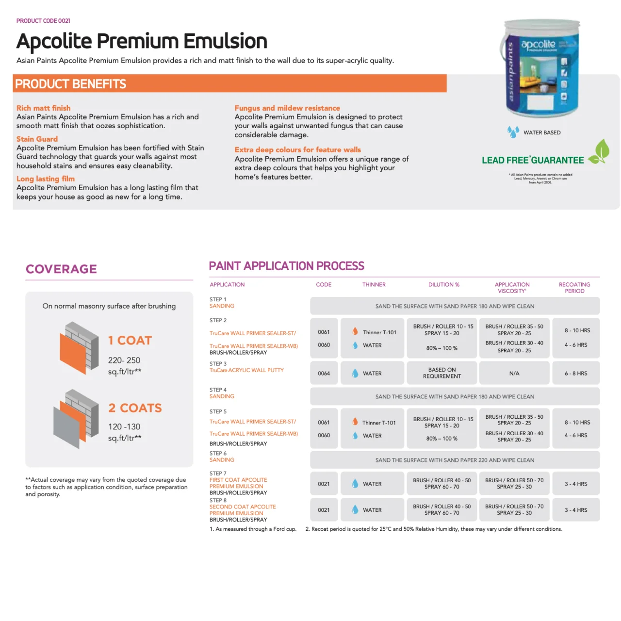 Technical Specifications: Asian Paints Apcolite Premium Emulsion