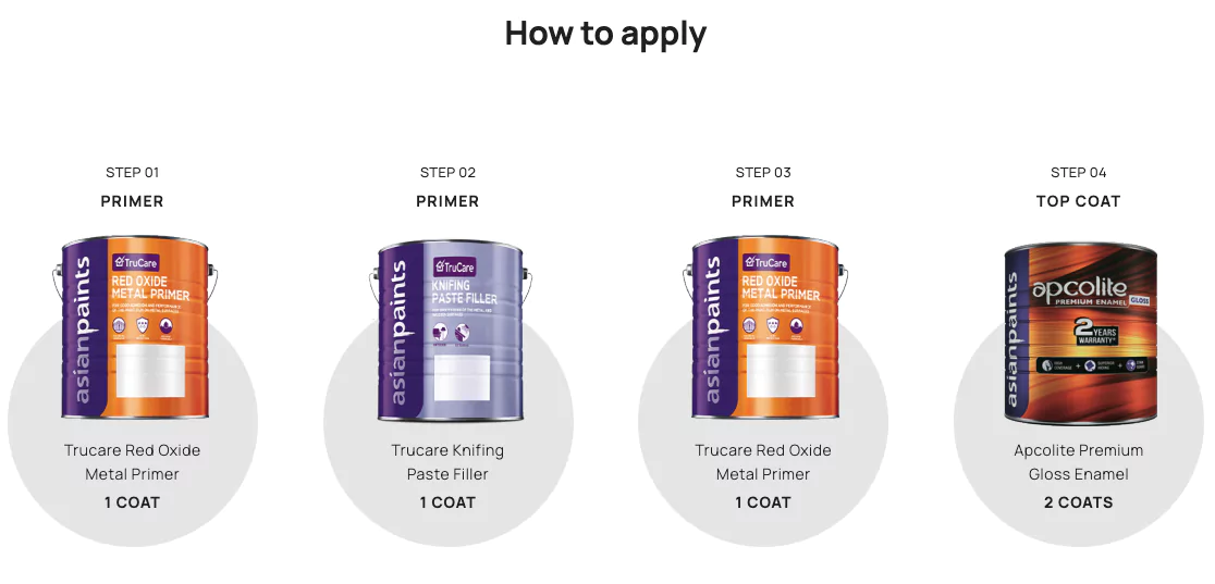 - Metal: Apply Asian Paints Red Oxide Metal Primer.