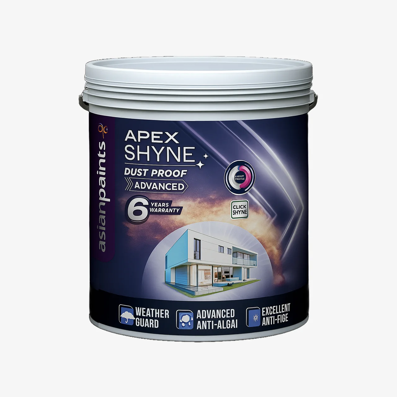 A home that shines from the outside reflects the pride of the people living inside. Asian Paints Apex Shyne Dust Proof Exterior Emulsion is a premium water-based exterior paint designed to give your walls a rich, high-sheen finish that lasts. It sits a notch above the standard Apex, offering not just protection but a glowing radiance that enhances the curb appeal of your property.