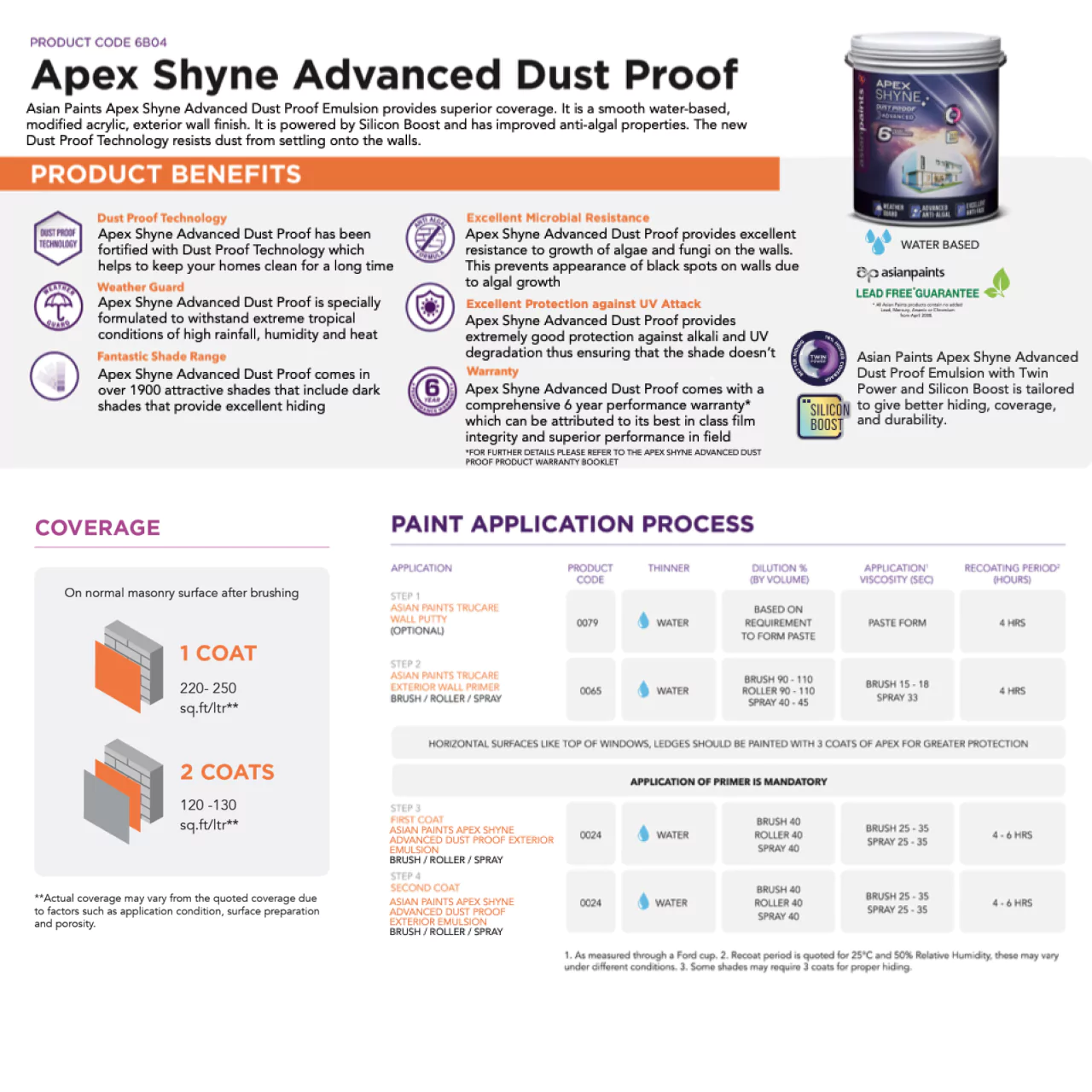 Technical Specifications: Asian Paints Apex Shyne Dust Proof Exterior Emulsion