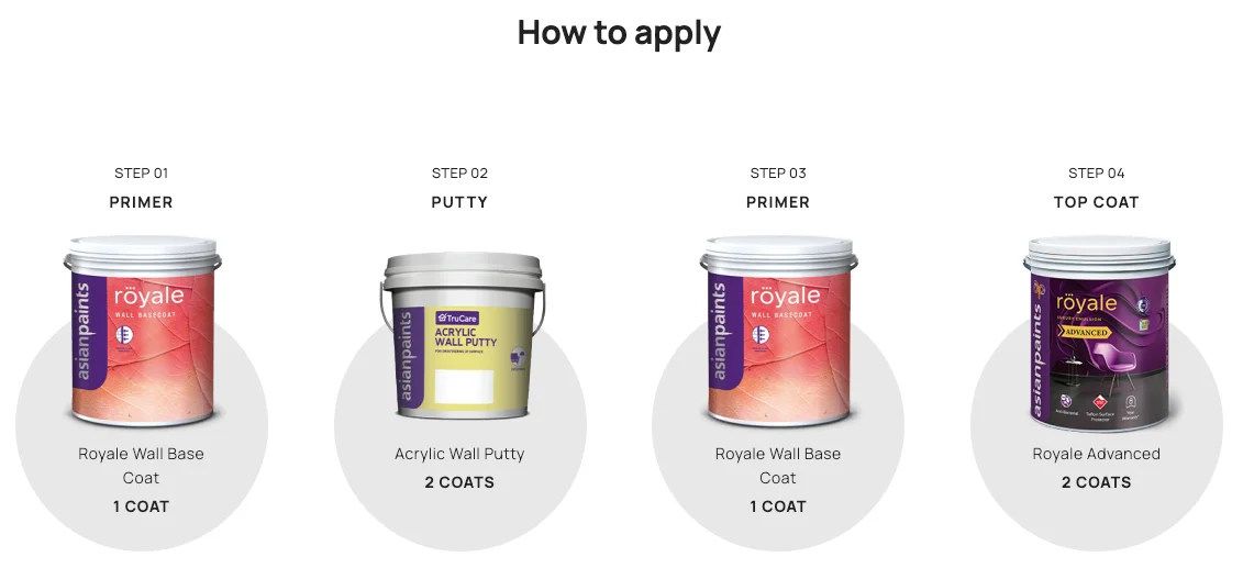 2. Priming: Apply 1 coat of Asian Paints Royale Wall Base Coat for maximum whiteness and protection, or Asian Paints TruCare Interior Wall Primer.
