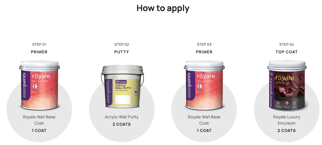 - Priming: Apply 1 coat of Asian Paints Royale Wall Base Coat for maximum whiteness and protection, or Asian Paints TruCare Interior Wall Primer. Priming is crucial for adhesion and uniform sheen.