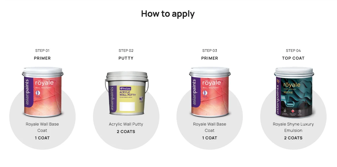 2. Priming: Apply 1 coat of Asian Paints Royale Wall Base Coat for maximum whiteness and protection, or Asian Paints TruCare Interior Wall Primer.