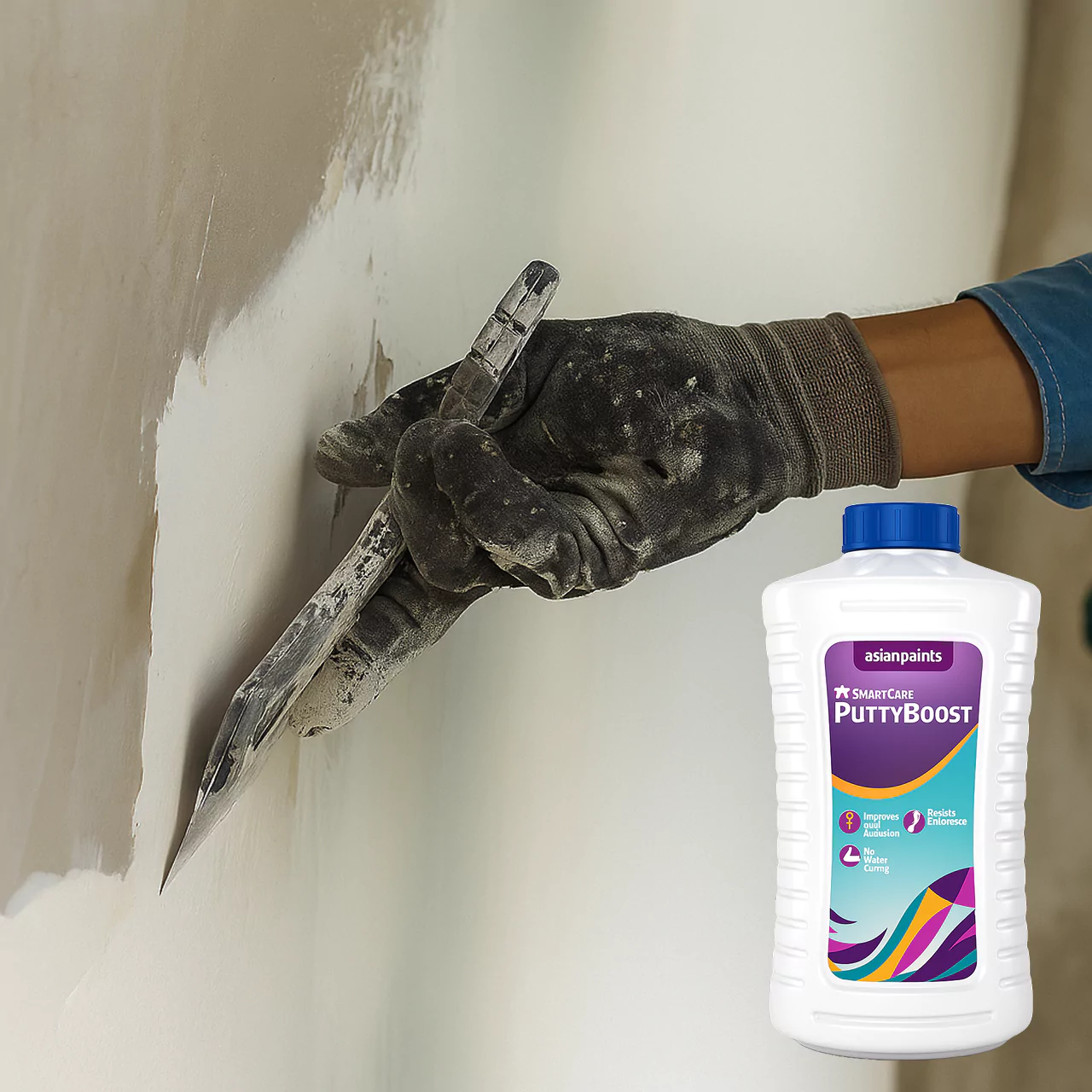 A: No. Asian Paints SmartCare Putty Boost is designed for powder-based white cement putties. Acrylic putty is already a paste and doesn’t need extra binders.