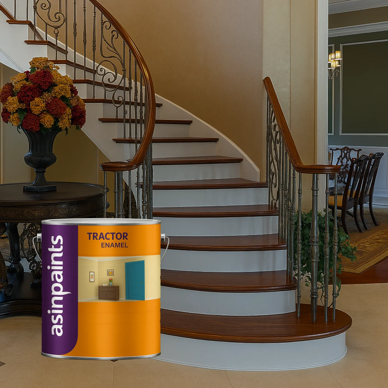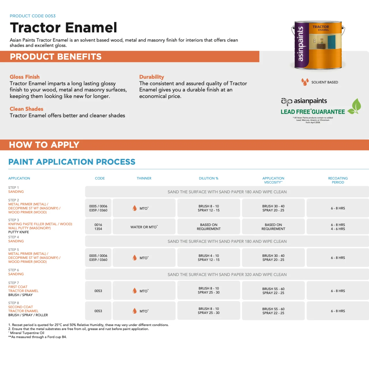 **Asian Paints Tractor Enamel** is the most trusted and economical choice for achieving a durable, high-gloss finish on interior wood and metal surfaces. This solvent-based paint is formulated with synthetic resins to provide a tough, protective film that resists scratches, mild chemicals, and household stains, all at a value-for-money price point.