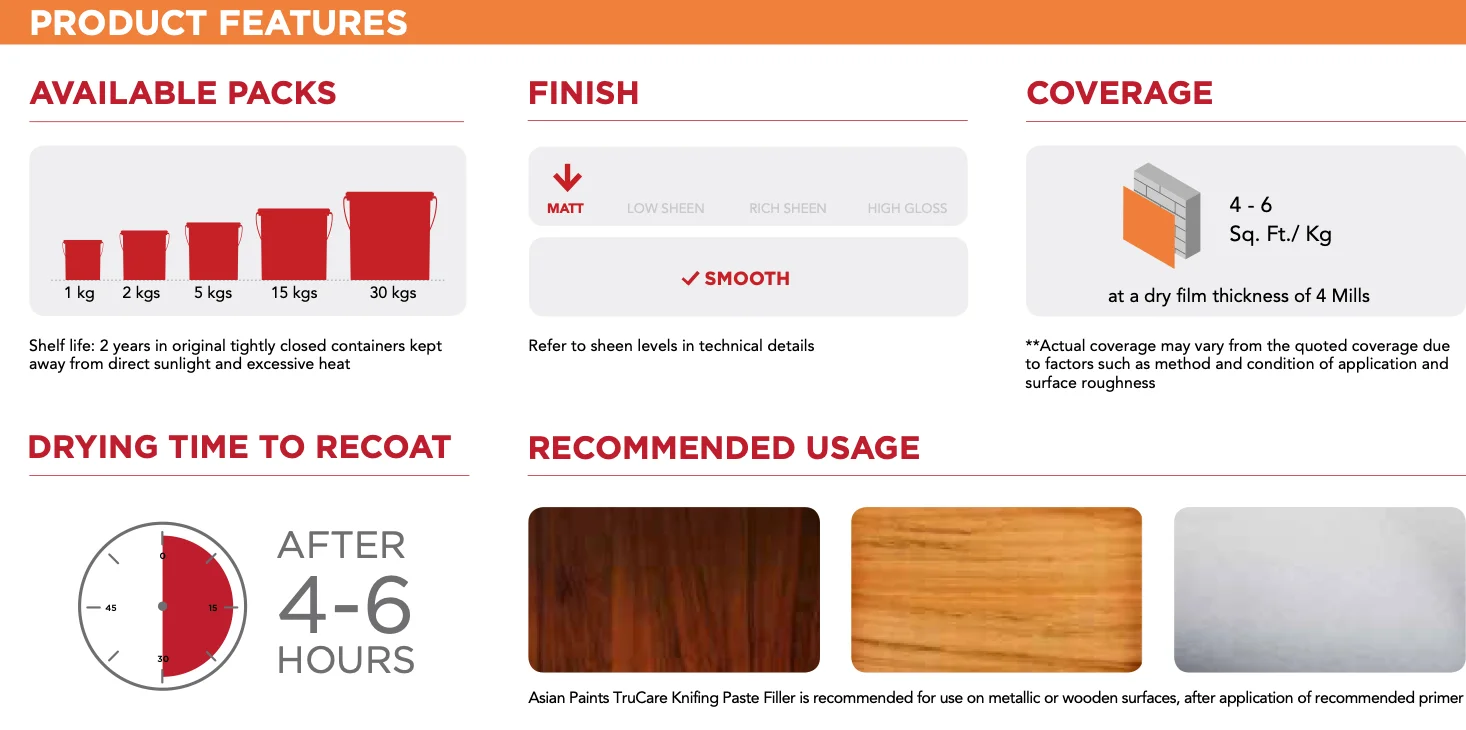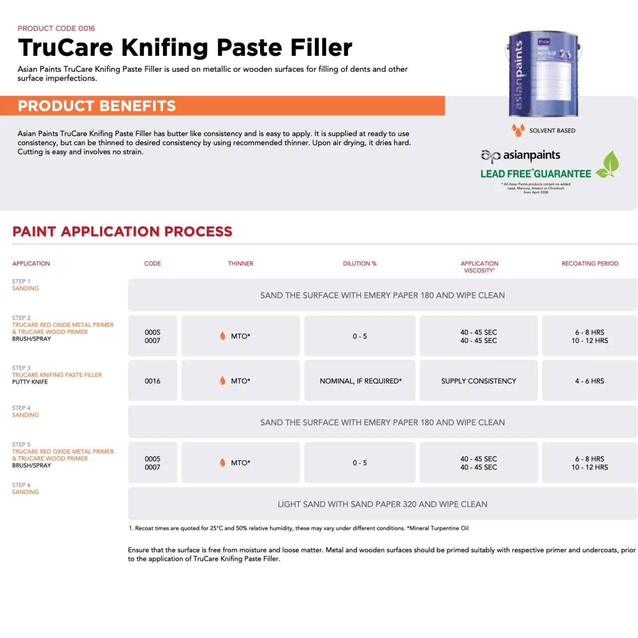 Technical Specifications: Asian Paints TruCare Knifing Paste Filler