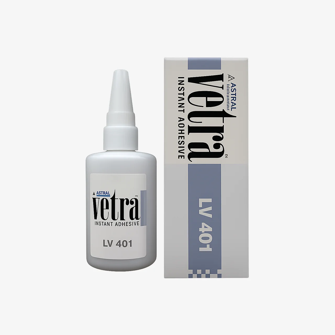- Application: Apply a single drop of Vetra LV-401 directly to the seam or joint. The glue will instantly wick (flow) along the entire seam via capillary action. Use sparingly; excess glue will not cure properly.