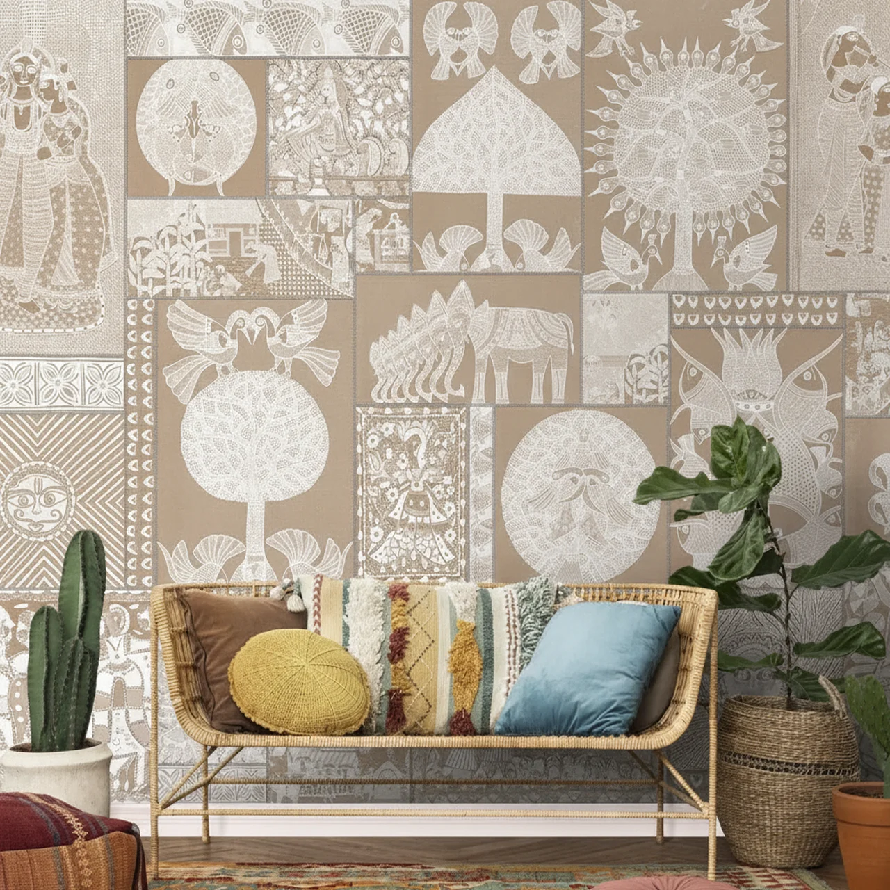 - Sandstone Texture: A granular matte finish that gives the wallpaper the look of a painted mud wall, paying tribute to the origins of Madhubani art. (Durable but best cleaned with a dry cloth).
