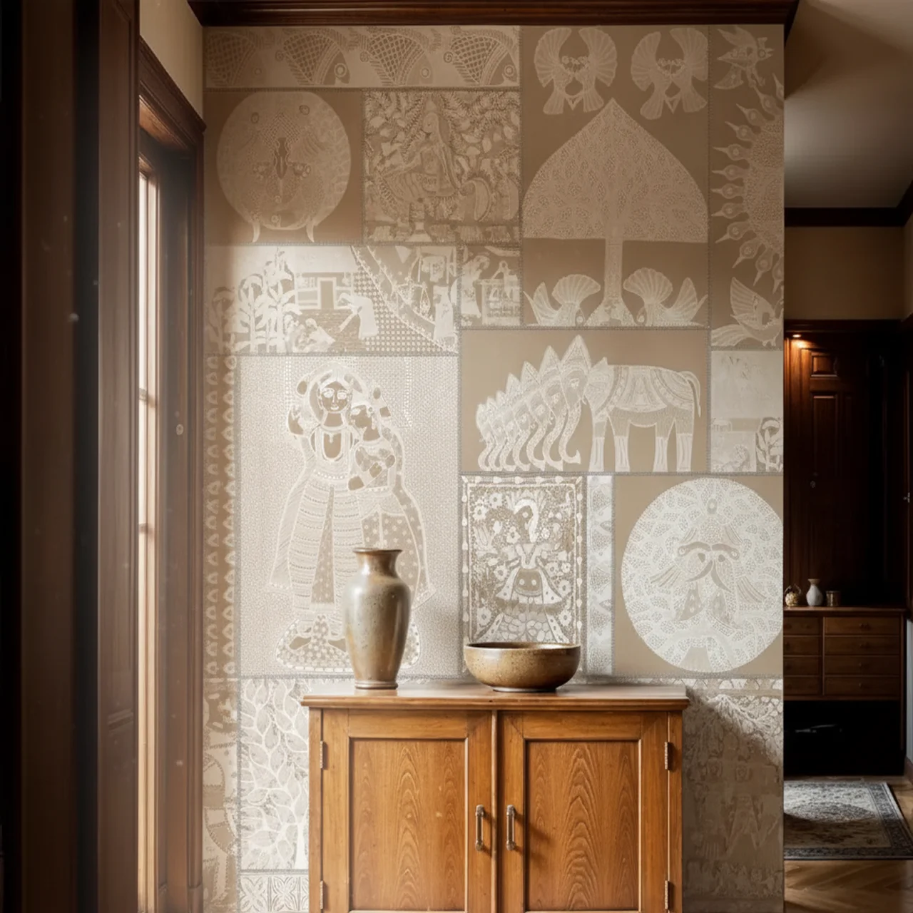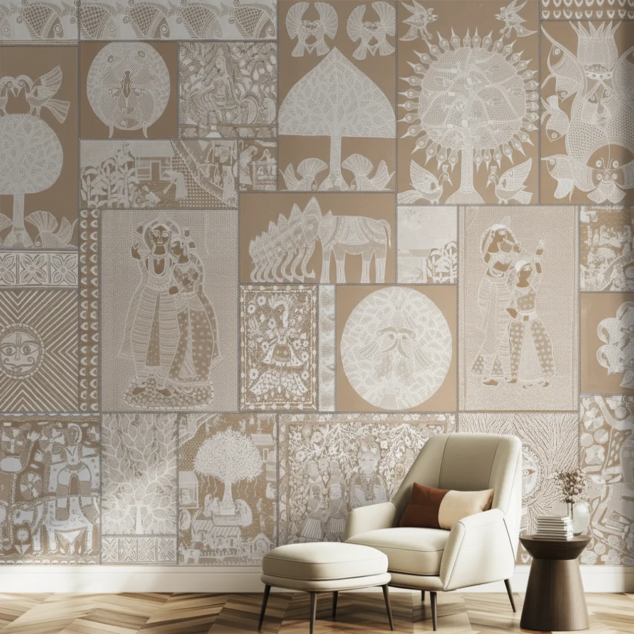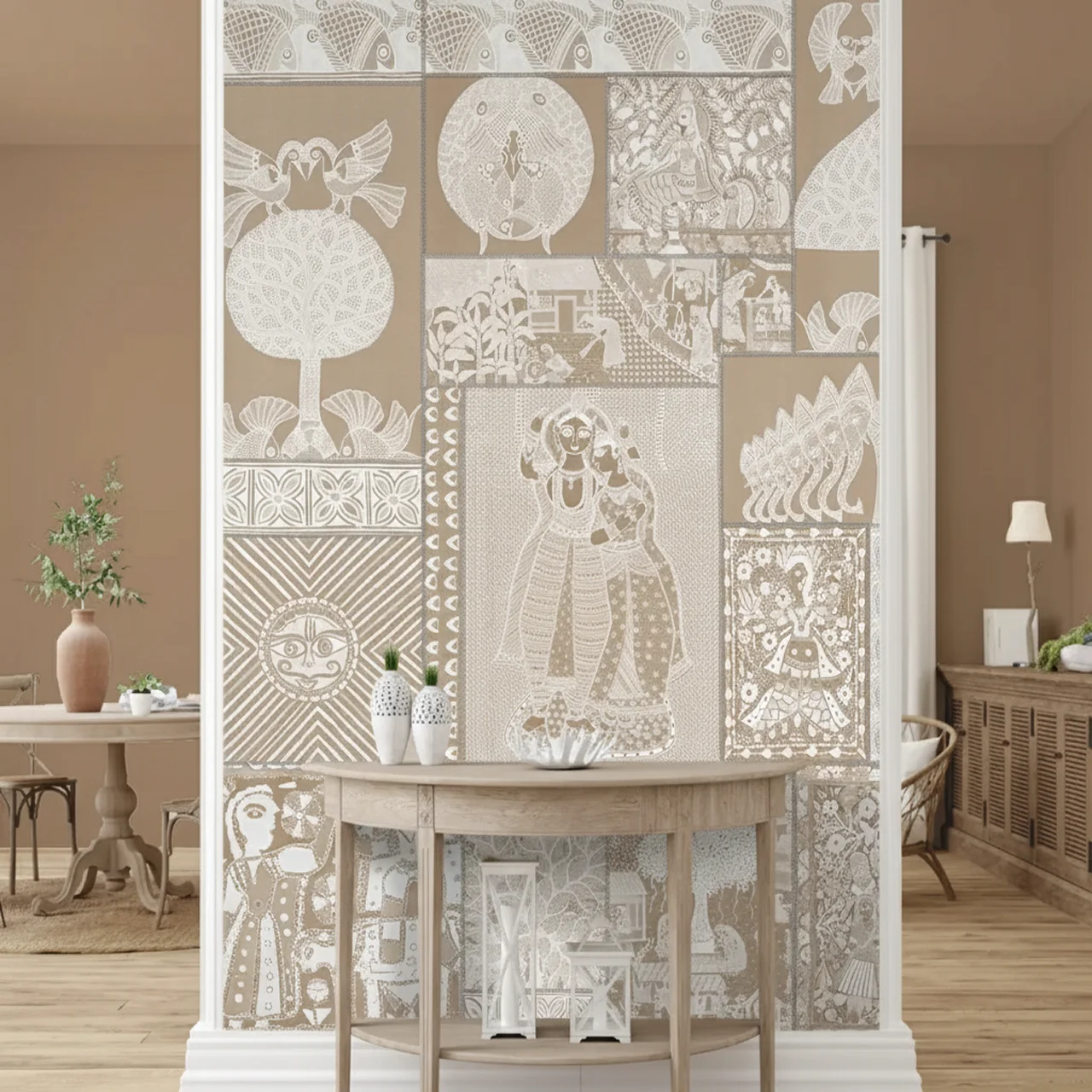This isn’t just a wallpaper; it is a piece of cultural heritage. It captures the raw, earthy essence of folk art with high-definition precision, transforming a plain wall into a storytelling canvas. It is the perfect statement piece for a traditional Indian living room, a spiritual Pooja room, or a contemporary space needing a touch of ethnic warmth.