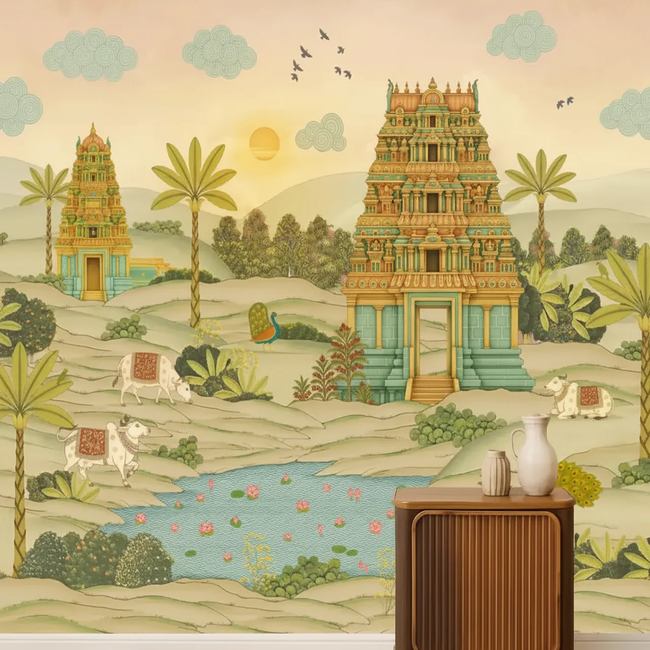 This isn’t just a wallpaper; it’s a sanctuary. Whether you are designing a dedicated Pooja room, a traditional living area, or an ethnic foyer, this South Indian heritage wallpaperinstills a deep sense of peace, culture, and devotion. It transports you to the spiritual heart of India every time you enter the room.