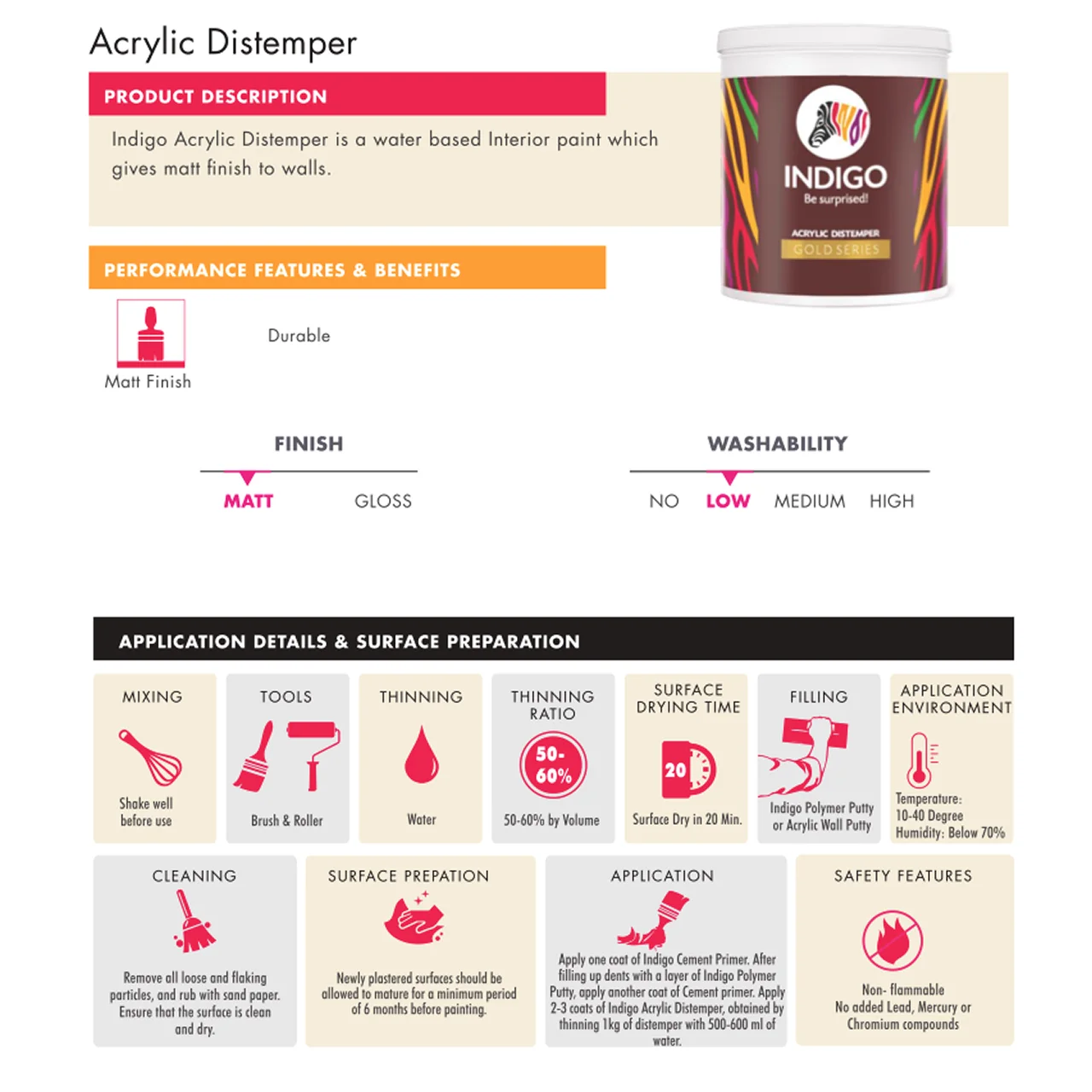 Technical Specifications: Indigo Acrylic Distemper (Gold Series)
