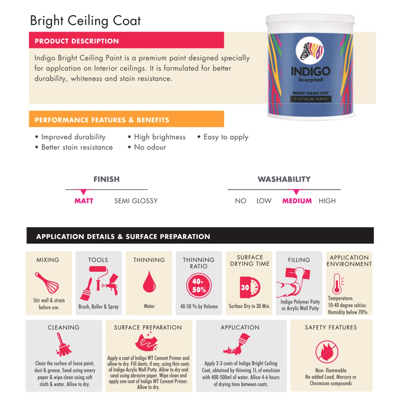 A: While possible, it is not recommended. This formula is specialized for ceilings. For walls, use a dedicated Indigo Interior Emulsion for better scrub resistance.