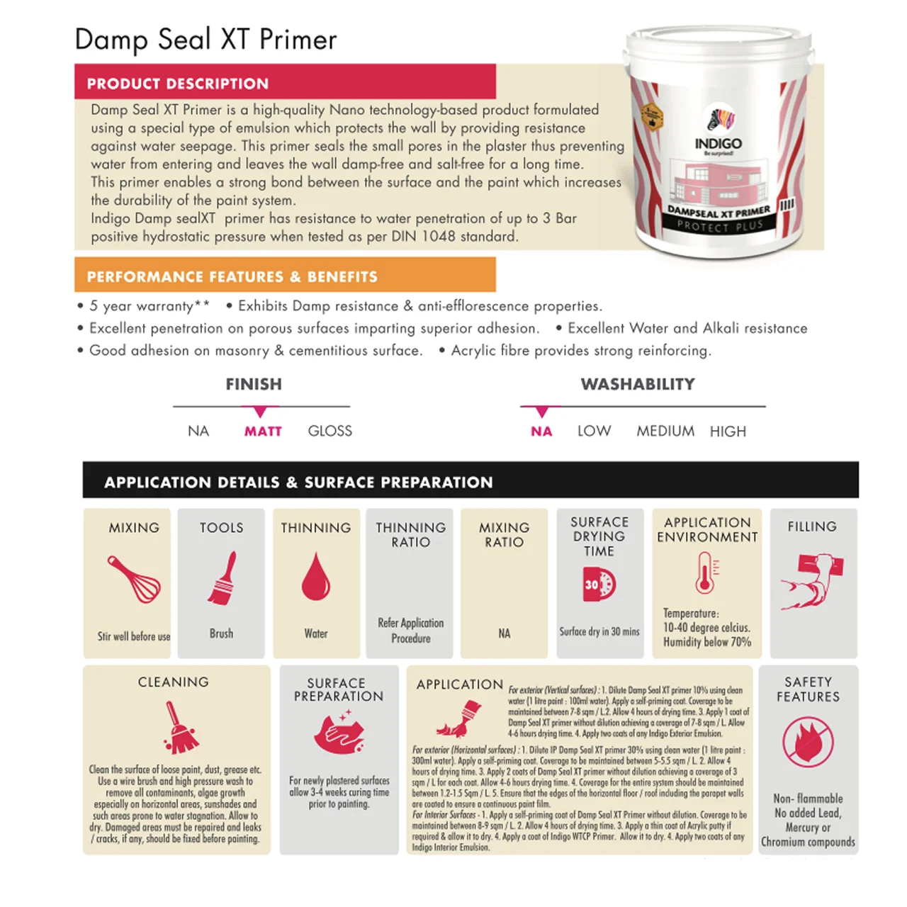 - Use Indigo Damp Seal Primer (This Product): Use this *after* the wall is as dry as possible, OR after you have applied a treatment like Damp Stop 2K. This damp proof primer acts as the final “seal,” locking in any residual moisture, blocking stains, and getting the wall ready for wall putty and paint. It is a 1-component, easy-to-use primer.