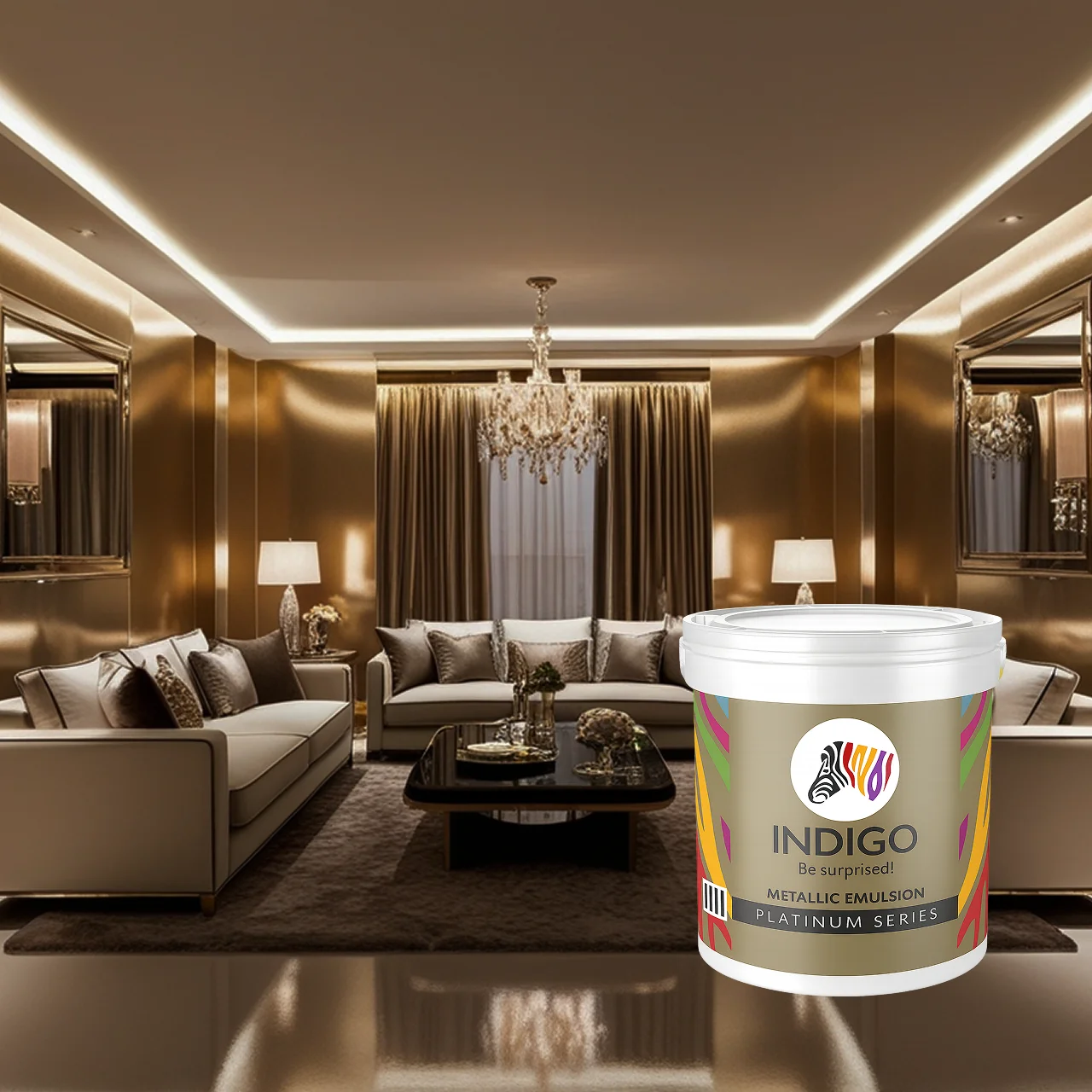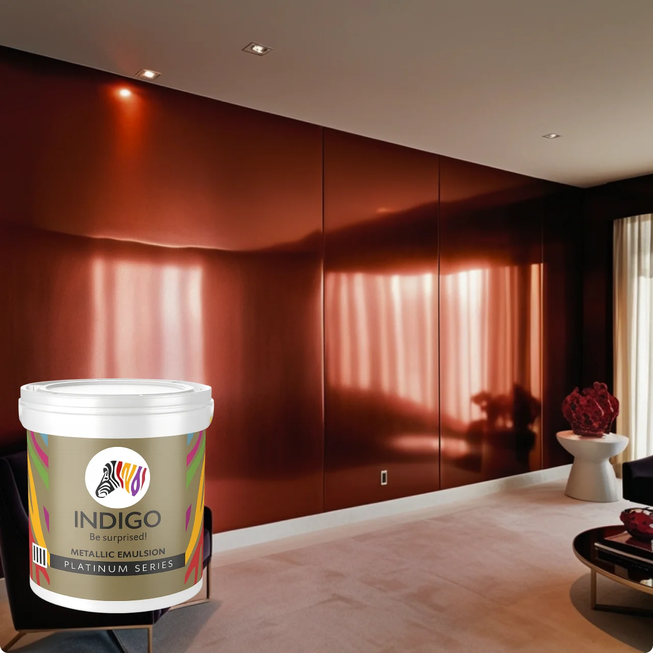 Achieve a stunning, reflective designer finish that catches the light and adds depth to your interiors with Indigo Metallic Emulsion (Metallic Paint). This premium, water-based metallic paint is formulated with fine metallic pigments that deliver a soft, luxurious shimmer—ideal for creating highlight walls, niche accents, and unique texture effects.