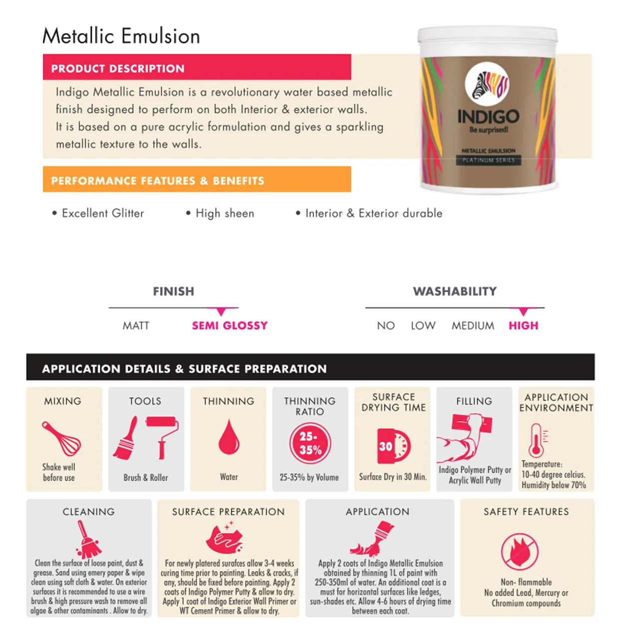 Key Features of Indigo Metallic Emulsion (Metallic Paint)