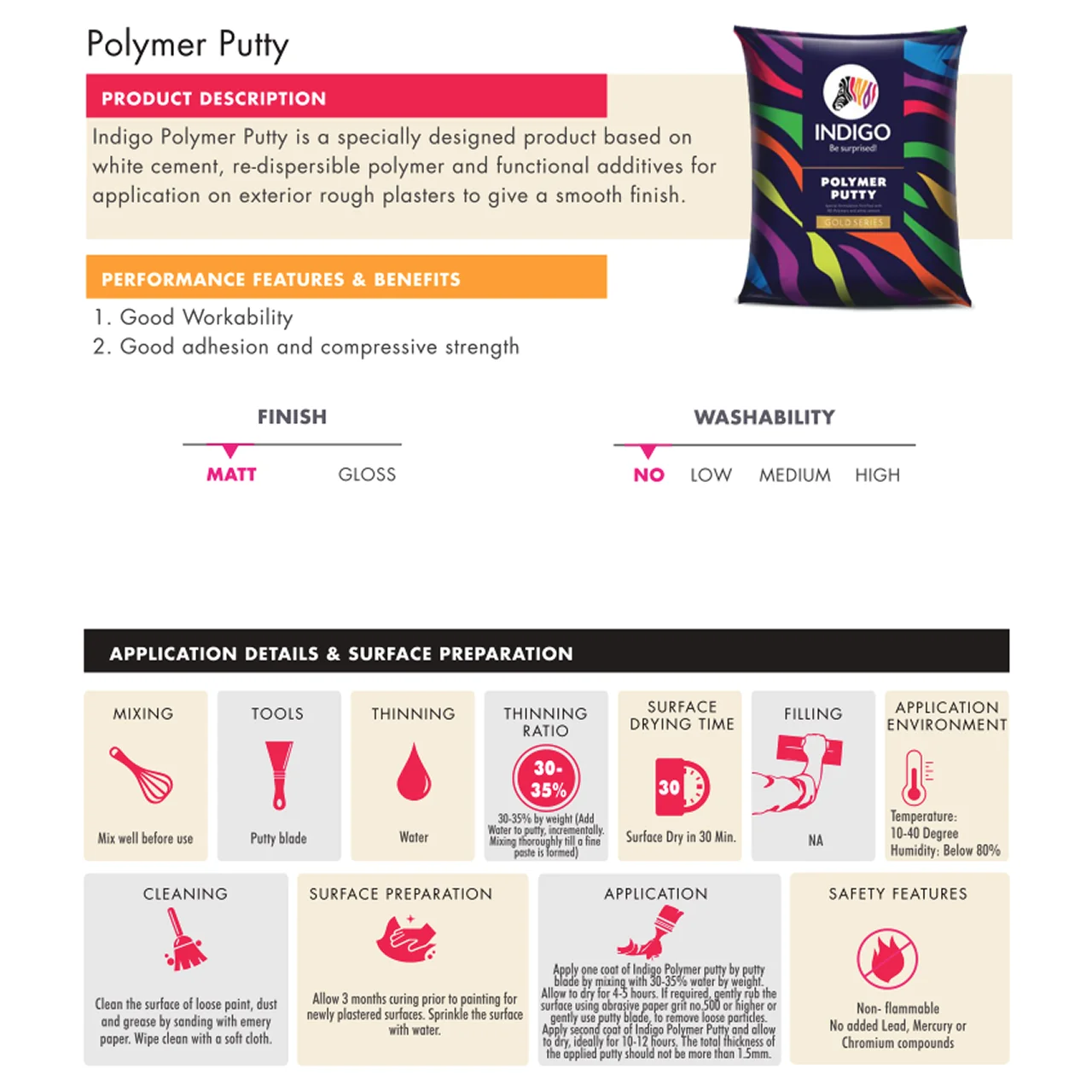 For the professional finish that requires longevity, Indigo Polymer Putty Gold Series works seamlessly under high-end coatings like Asian Paints Royale and Asian Paints Apex Ultima, ensuring those luxury finishes retain their true colour and sheen without chalking or flaking.