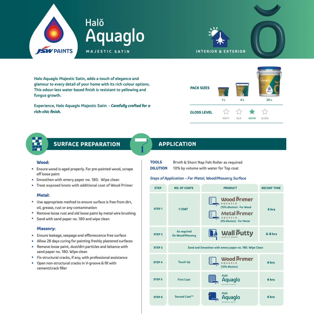 – For Metal: Use a suitable metal primer. - Application: Thin **JSW Aquaglo Majestic Satin Enamel** with 10-15% water for brushing/rolling, or 20-25% for spraying. Apply the first coat using a high-quality brush or roller.