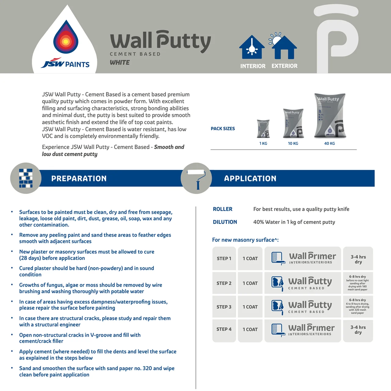 - Mixing: Mix the JSW Wall Putty powder with clean water in a ratio of approx. 35-40% water by weight. Stir vigorously for 5-10 minutes to get a smooth, lump-free paste. Let it stand for 5 minutes, then mix again.