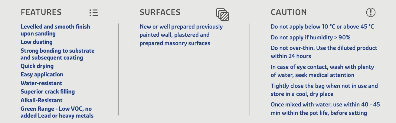 This versatile **wall putty** is suitable for various surfaces: