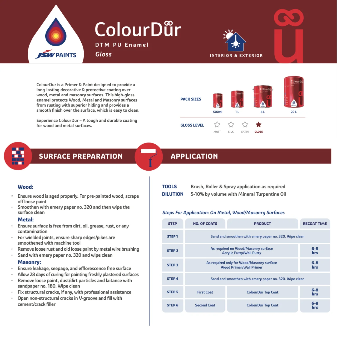 - Mixing: Dilute JSW ColourDur DTM PU Enamel with General Purpose Thinner (MTO) as per the recommended ratio. Stir thoroughly.