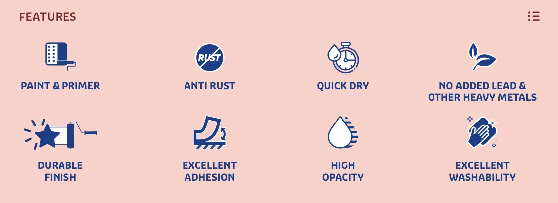 | Coverage | Approx. 120 – 140 sq. ft/litre/coat (Varies by surface) |