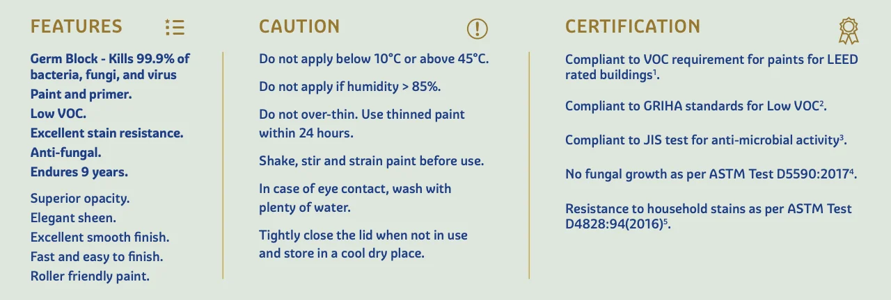 • Low VOC: As a water-based product, JSW Halo Majestic Interiors Shine has low volatile organic compounds, ensuring a safer and healthier indoor environment.
