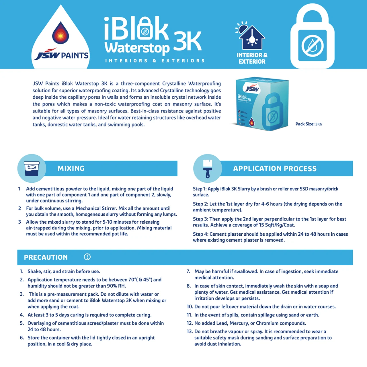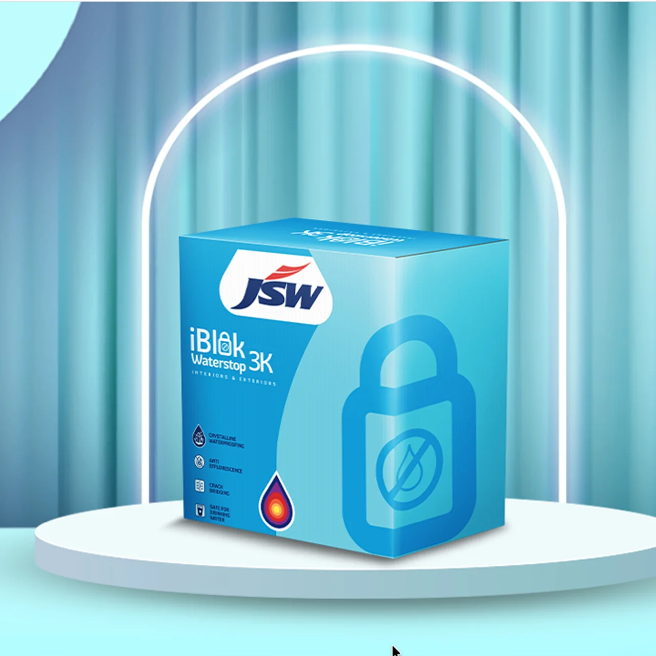 JSW iBlok WaterStop 3K is a professional-grade, two-component (2K) cementitious-modified acrylic waterproofing system. Designed to withstand extreme hydrostatic pressure, this product is the ultimate solution for waterproofing critical areas like terraces, bathrooms, and exterior walls suffering from severe dampness.