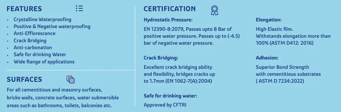 - Hydrostatic Pressure Resistance: Designed to resist water pressure from both the positive side (water pushing down, e.g., terrace) and negative side (water pushing out, e.g., basement/damp interior walls).
