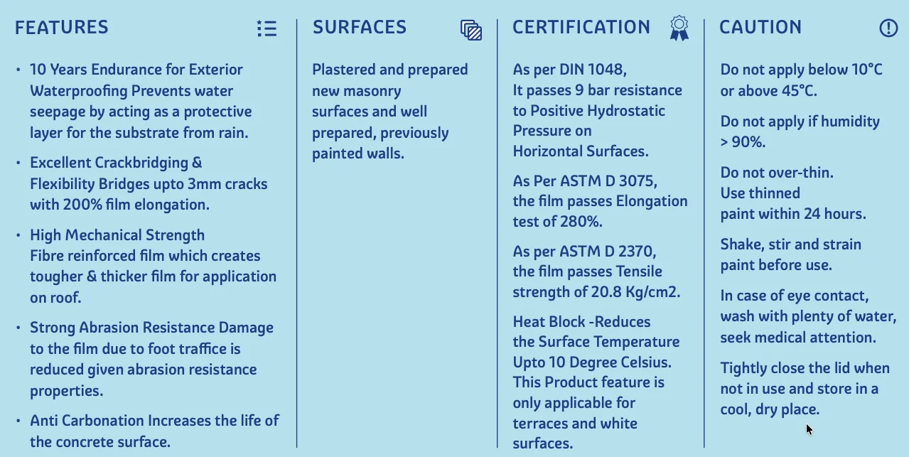 - Heat Reduction (Cool Roof): Available in light colours (typically White), the coating reflects UV rays and solar heat, keeping the roof slab cooler and reducing the internal temperature of the top floor.
