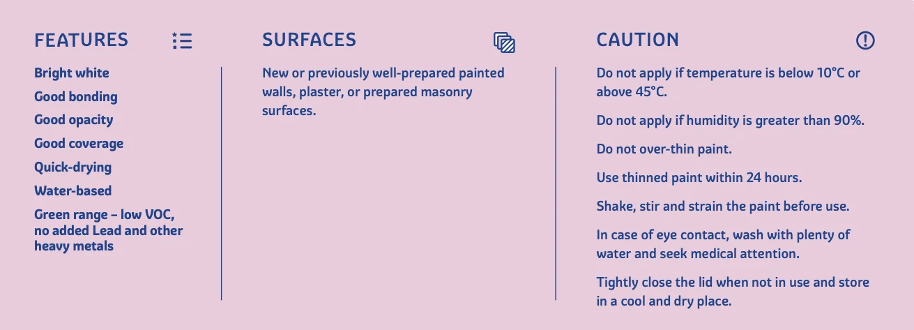 - Good Opacity: Helps in covering minor surface variations and preparing the wall for lighter topcoat colours.
