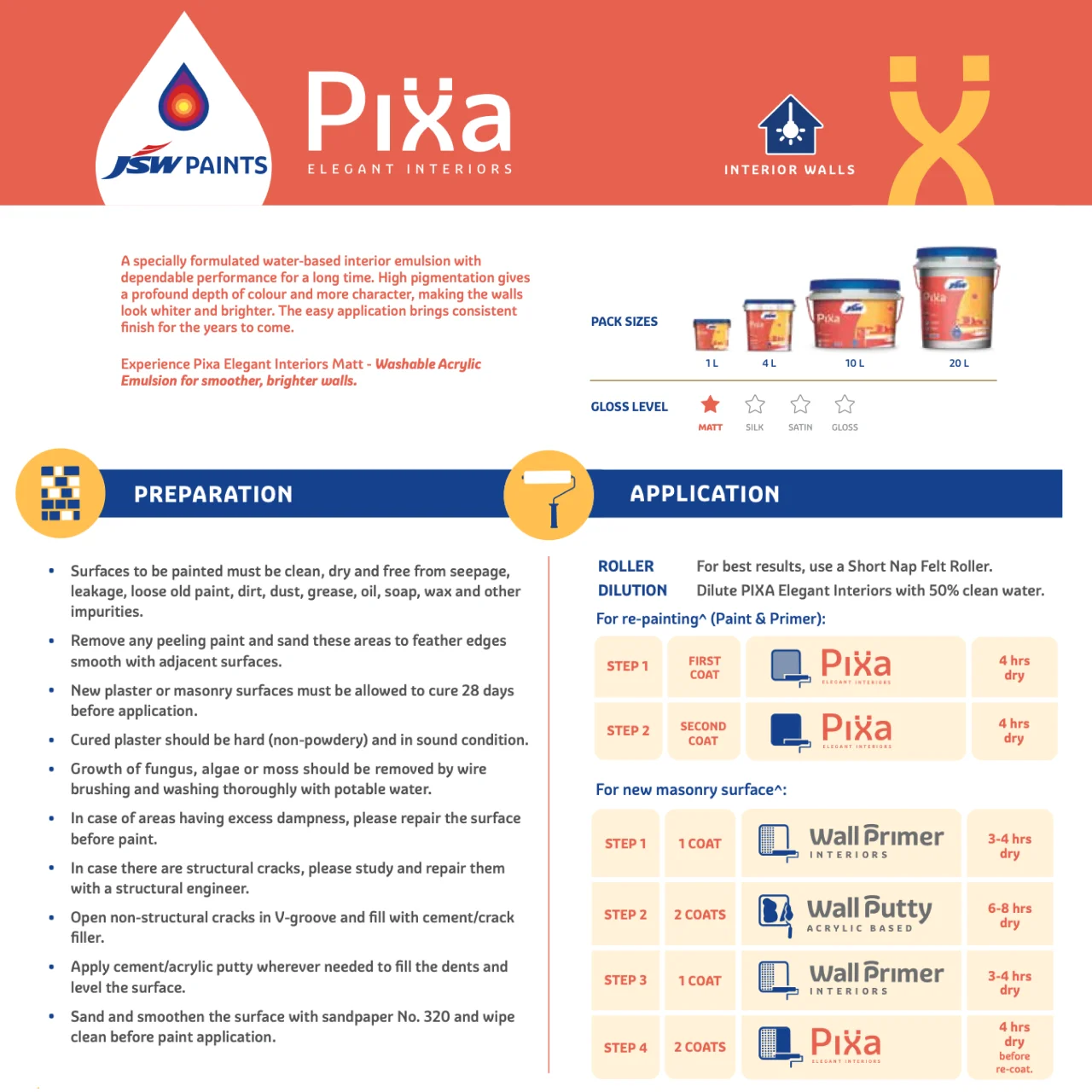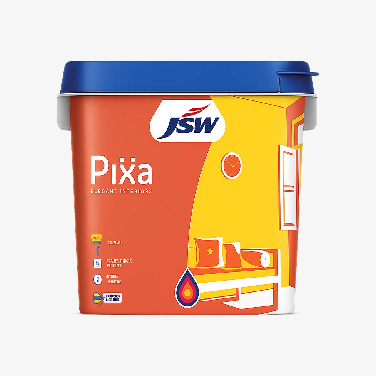 JSW Paints Pixa Elegant Interior is a high-quality, water-based emulsion designed to give your walls a superior, smooth, and matt finish. With its “Paint & Primer” formula, it provides exceptional brightness, coverage, and a beautiful, enduring look that is a significant upgrade from ordinary distemper.