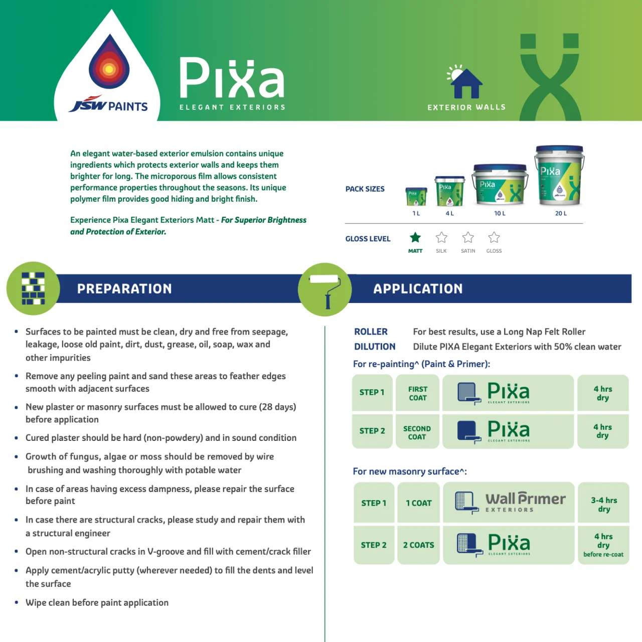 - Application: Thin JSW Pixa Matt Exterior Paint with 30-40% potable water for the first coat and 20-30% for the second coat. Apply using a brush or roller.