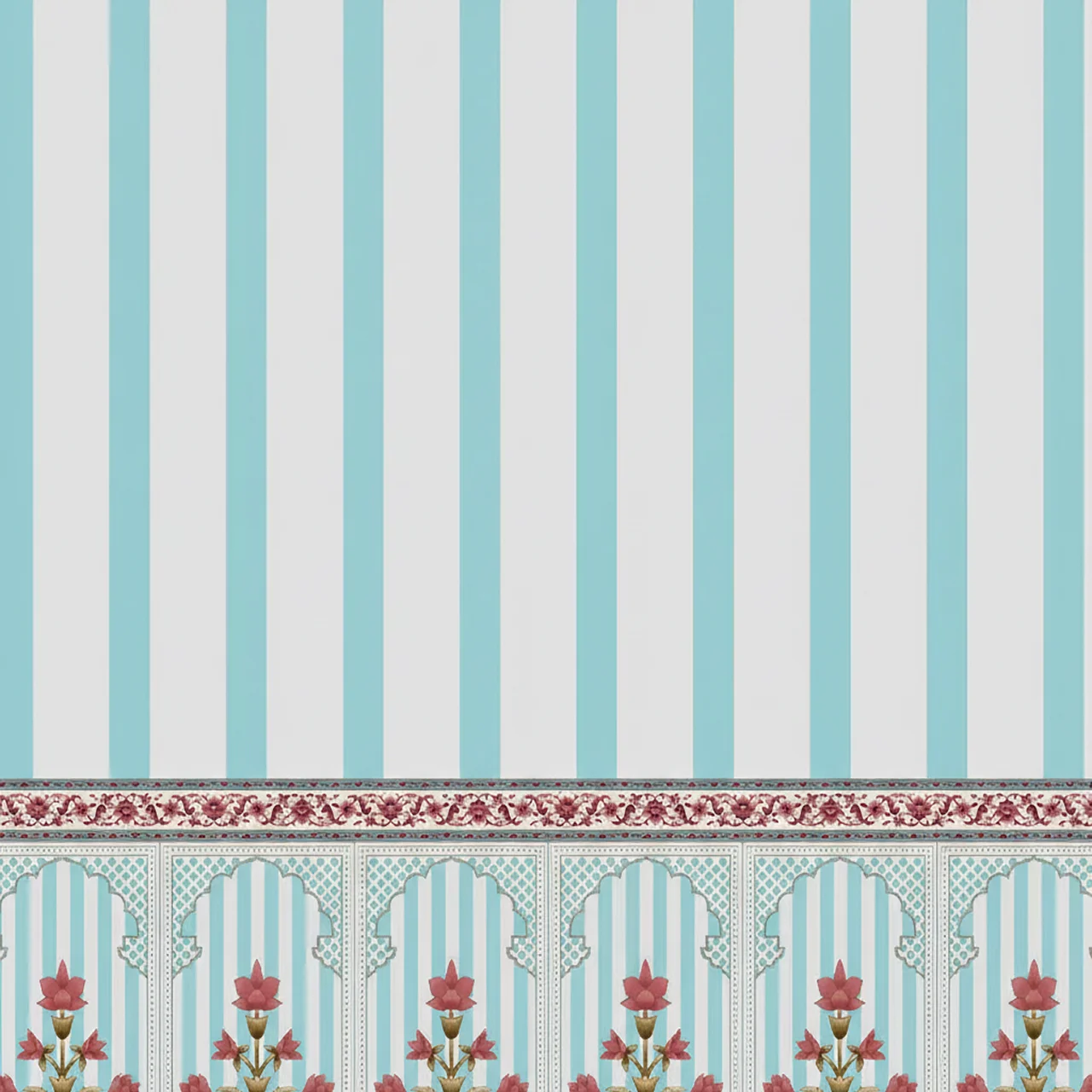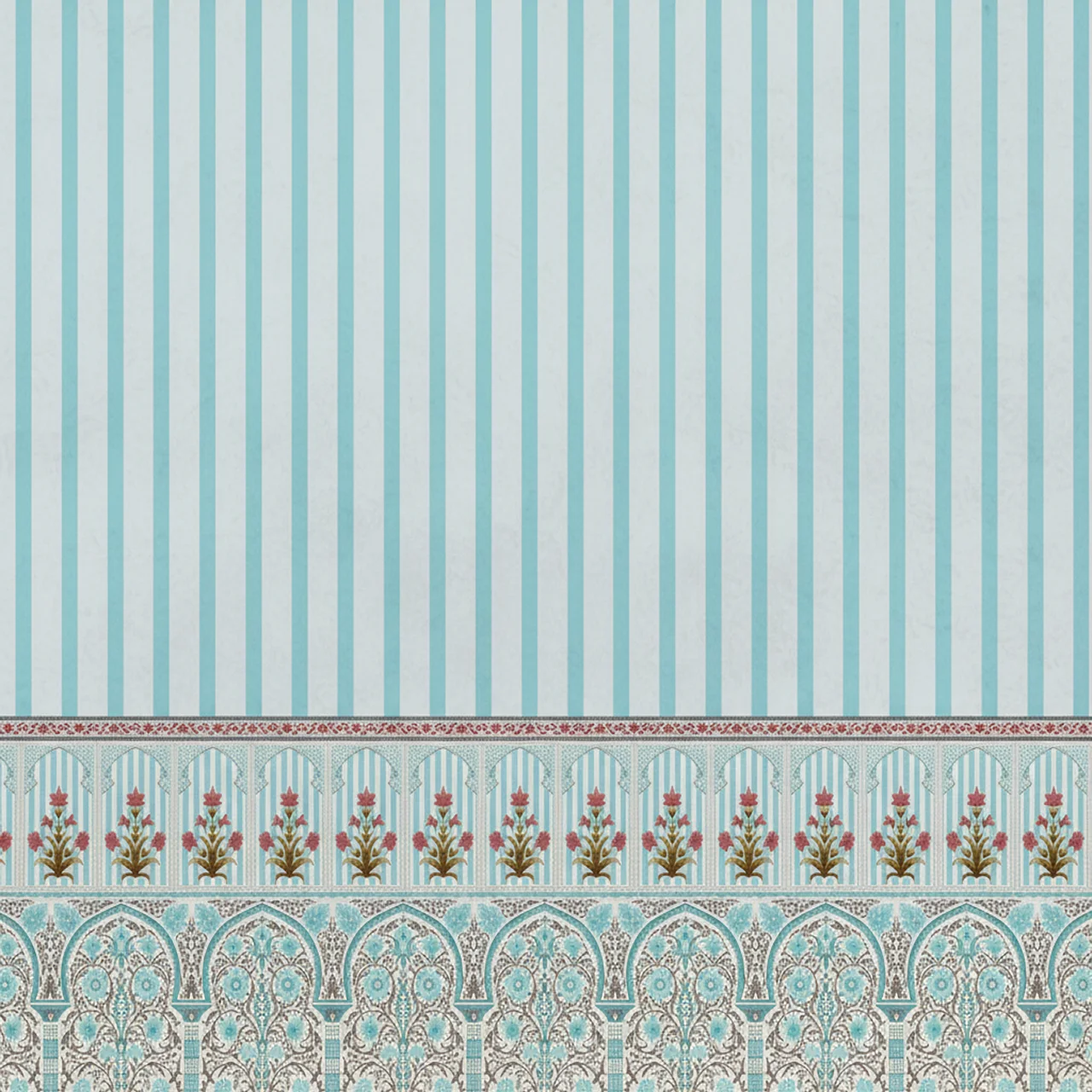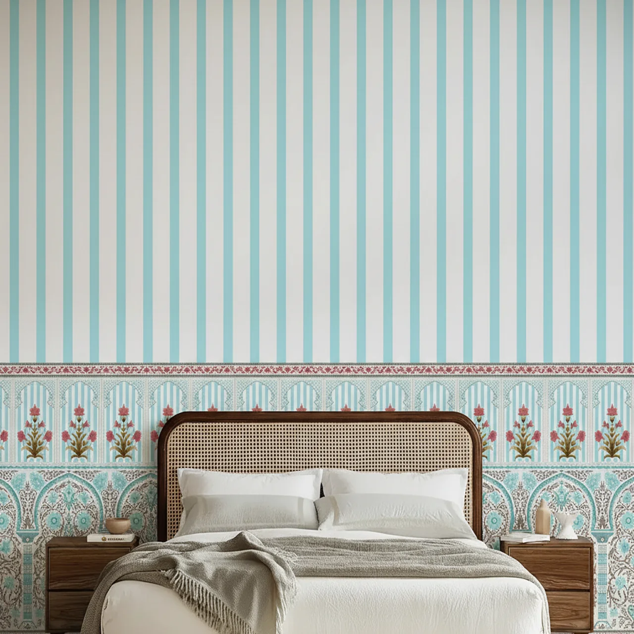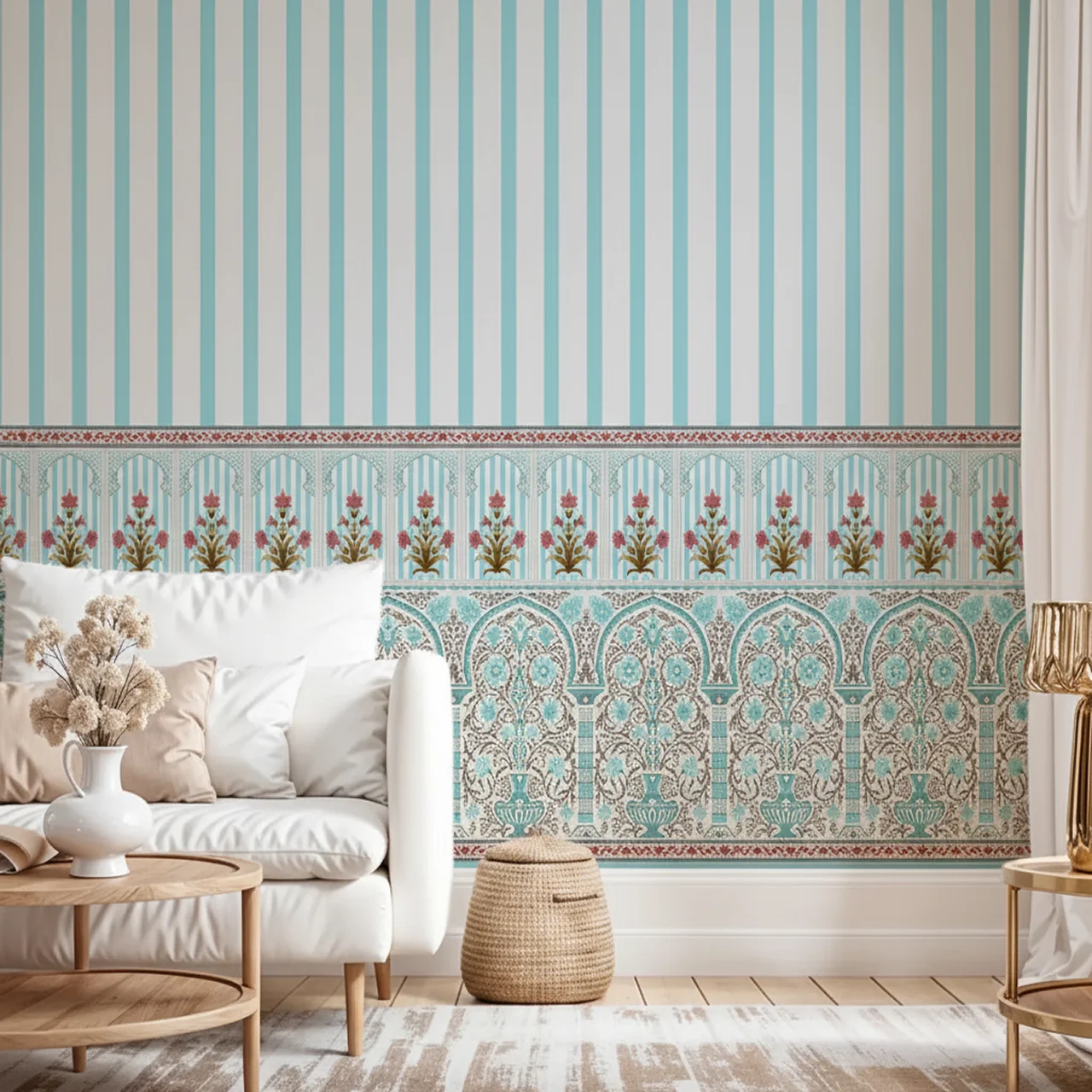 Bring the architectural splendor of Rajasthan’s palaces into your home with our Kusum Indian Floral Jharokha Wallpaper. Designed exclusively by OnlinePaints.in, this exquisite wallcovering blends the structural elegance of “Jharokhas” (traditional overhanging enclosed balconies) with the softness of “Kusum” (flowers). Set against a calming blue background, the design alternates between intricate floral Jharokha motifs and elegant stripes, creating a rhythm of royalty and grace on your walls.
