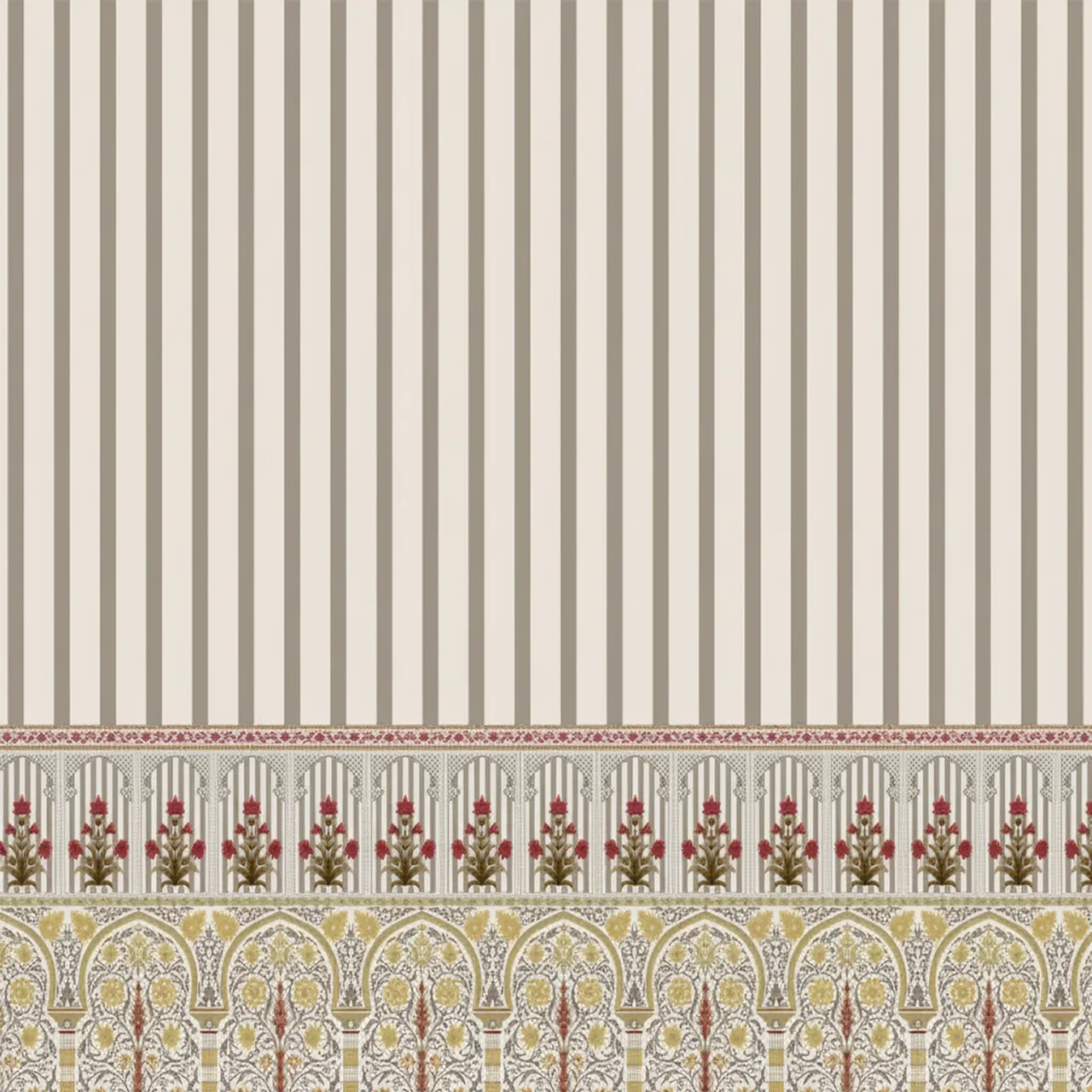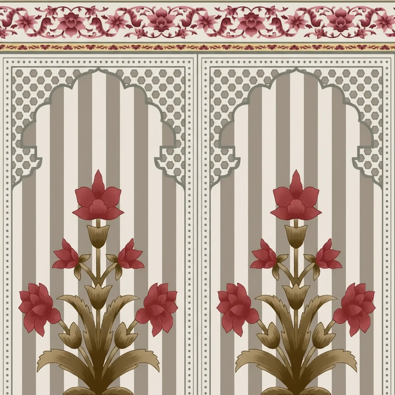 - Balanced Design: The vertical stripes provide height and structure, while the floral Jharokhas add softness and culture.