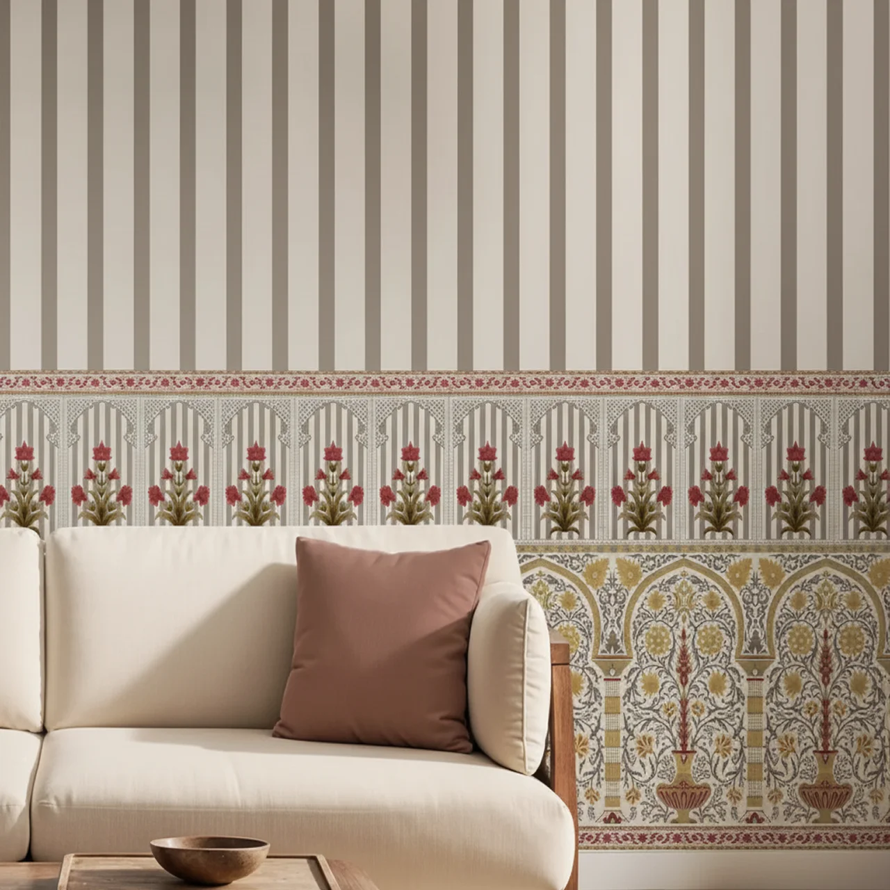 This isn’t just a wallpaper; it’s a mood lifter. Yellow is the colour of prosperity, happiness, and warmth in Indian culture. This heritage wallpaper instantly brightens up any room, making it feel larger, airier, and incredibly welcoming. It is the perfect backdrop for a lively living room or a spiritual Pooja room.
