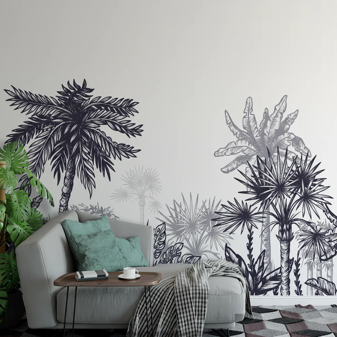 - Panel Application: The mural comes in numbered panels with an overlap. Use the “Double Cut” method for a seamless, invisible joint where the palm fronds connect.