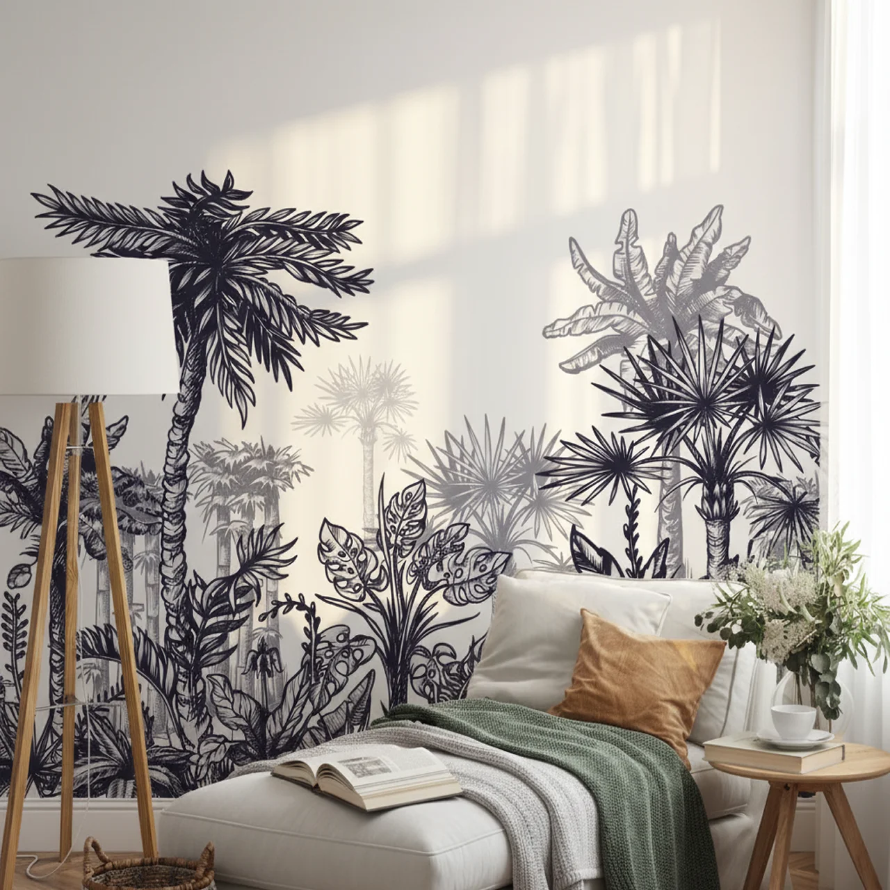 Unlike standard repeat-pattern wallpapers, this is a full-scale wall mural. It creates a panoramic view of a lush palm grove, adding immense depth and height to your room. It is the perfect statement piece for a colonial-style living room, a restful master bedroom, or a chic cafe looking for that “old-world charm.”
