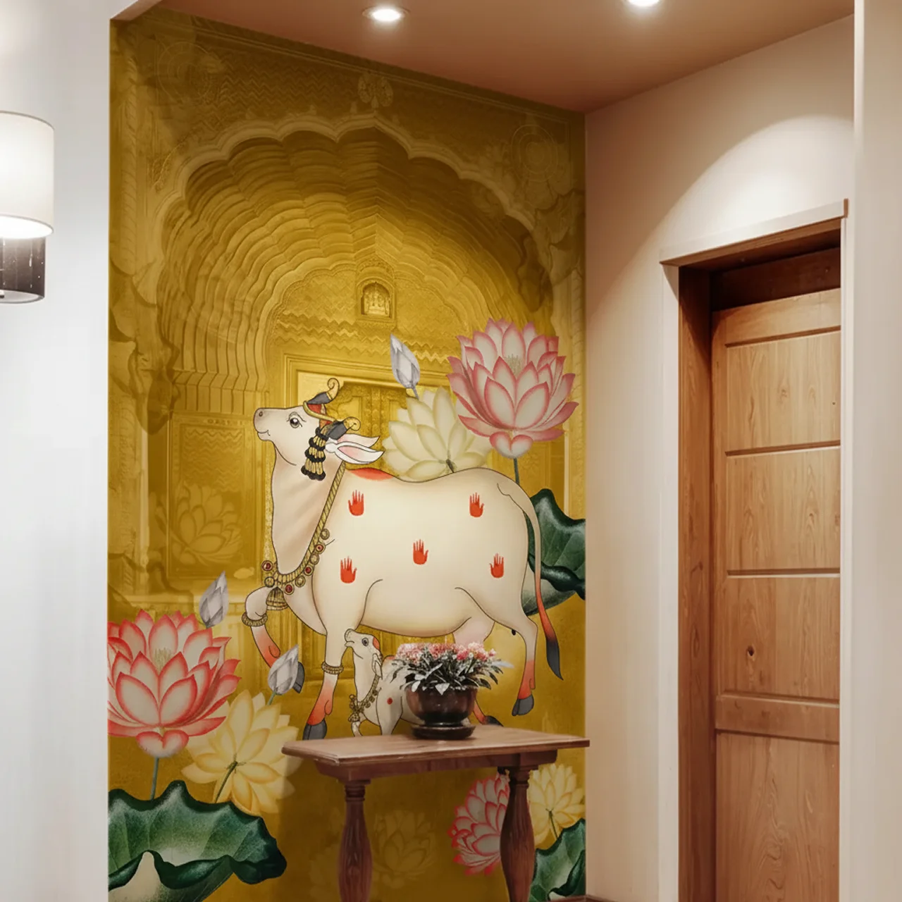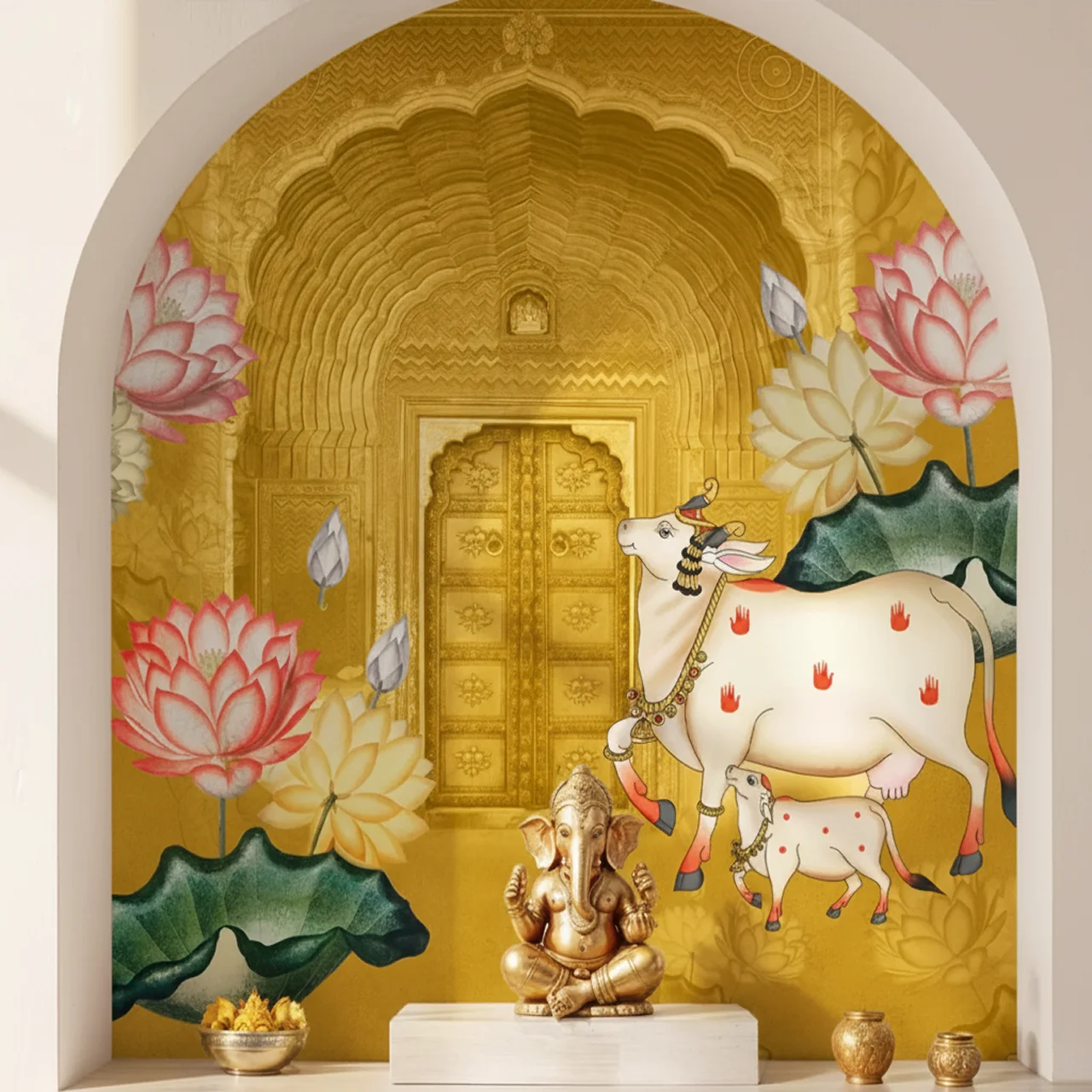 Pooja rooms and lobbies are high-traffic, sacred areas. Using cheap vinyl wallpapers that smell of chemicals goes against the sanctity of the space. Our **Pichwai Wallpaper** is crafted for purity: