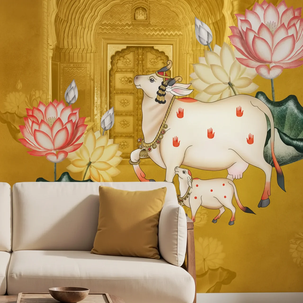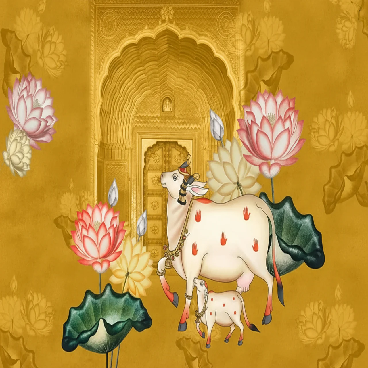 Transform your space into a sanctuary of peace and heritage with our Pichwai Style  Wallpaper Yellow | Blue. Designed exclusively by OnlinePaints.in, this exquisite wallcovering pays homage to the 400-year-old art form from Nathdwara, Rajasthan. The design features the auspicious combination of vibrant yellow (representing prosperity and knowledge) and divine blue (representing Lord Krishna), adorned with traditional motifs like blooming lotuses, sacred cows (Kamdhenu), and intricate floral vines.