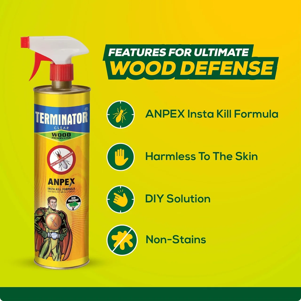 Pidilite Terminator is a specialized, ready-to-use wood preservative spray designed to protect wooden structures and furniture from internal and external damage caused by termites, borers, and other wood-destroying insects. It provides a long-lasting, invisible shield that penetrates deep into the wood fibers, ensuring permanent protection without altering the natural color or grain of the timber.